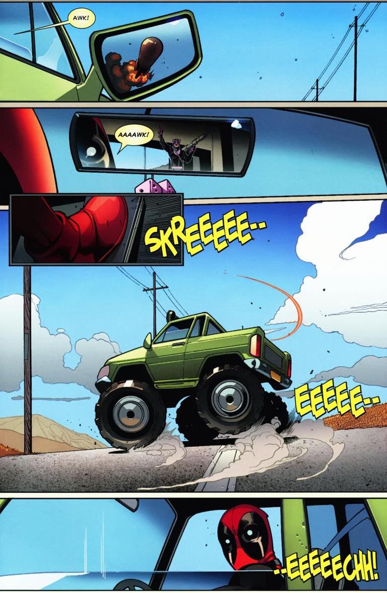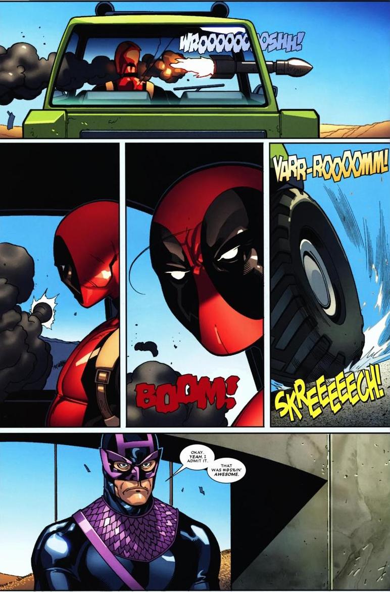 A large part of Deadpool’s charm is his schizophrenia. Arguing with the voices in his head and such. Turns his solo series into a team up. You see his appeal? No? Well, it’s stuff such as this: