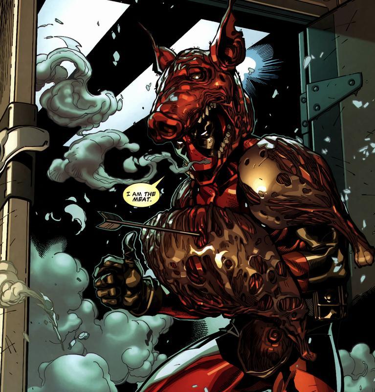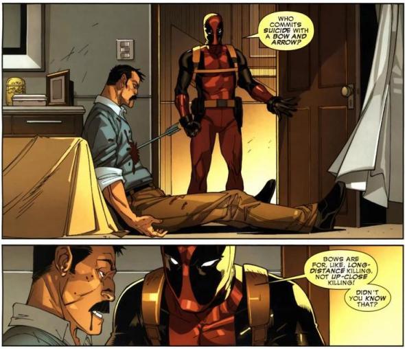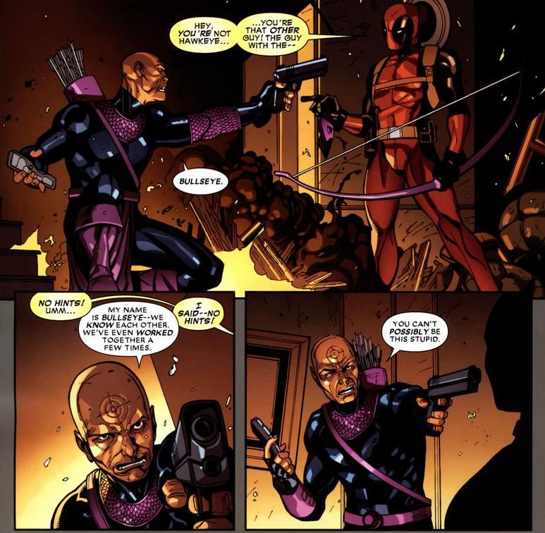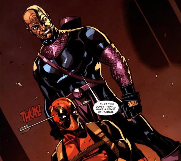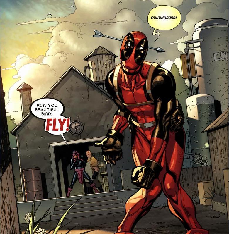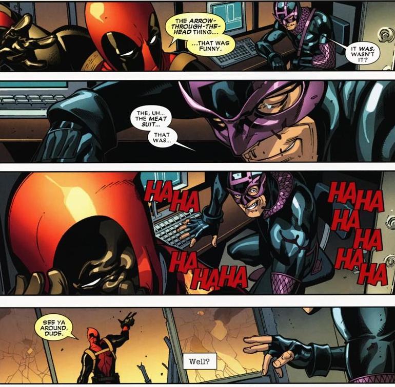 That healing factor makes Deadpool pretty much invincible. Around forty issues later, the Hulk will punch Deadpool so hard that his body liquefies, and he’s back to normal a few days later. So while an arrow through the brain ain’t physically lethal, I imagine it does screw up a few cognitive processes. Probably. I’m not a scientist.