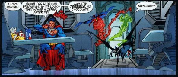 Someone’s going to be extra pissy when he finds out the world’s greatest superhero spent this time polishing off the League’s supply of Fritos. Big surprise, an antidote is found and Superman doesn’t have to attend sixth grade. He got to completely sweep away his worries for the first time in his life. Fortunately, this mini vacation comes with an introspective monologue.