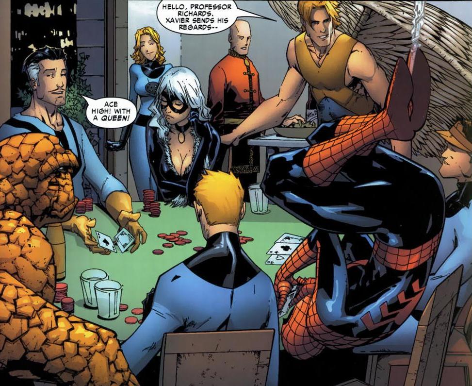 But you can’t sell an issue entirely on a card game where superheroes spend all 20 pages busting each other’s balls.  No, good sales require tension, excitement, and a little suspense.  Don’t you worry your little heads.  Just because not a single punch is thrown in this issue, it has all the excitement any normal Spider-Man adventure would have.