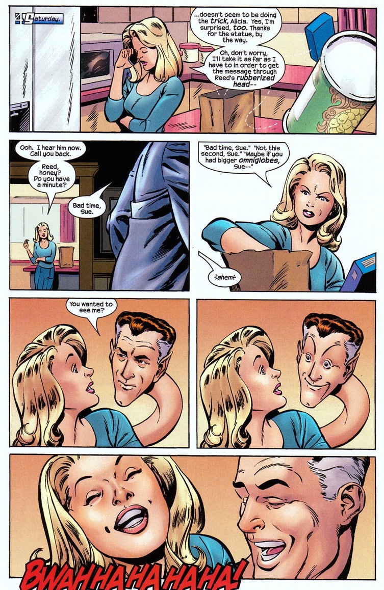 Don’t think Sue’s being unfair. Entire Fantastic Four stories have been devoted to how badly Reed ignores his responsibilities as a family man. But let’s be realistic here. You don’t get to be a super genius by being dumb. And Mr. Fantastic has a super genius solution.