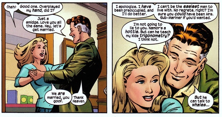 Reed can’t be even a quarter of a man if he puts up with her flirts with Namor. Come to think of it, if they were a real life couple, do you think she would have respect for a man who took her back after walking out on him three times?
