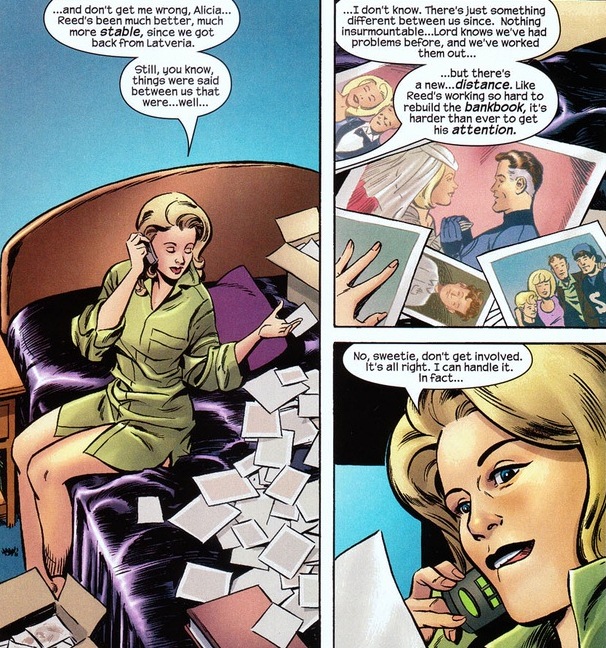 Reed does have someone to make Sue jealous! Her name is Alyssa Moy and she served a large part in Mark Millar’s Fantastic Four run as well as a minor part in Claremont’s run. And you’re right about Reed not being able to match Namor’s physicality. But Alyssa is introduced as Reed’s intellectual equal, making Sue (smart, but not a genius) jealous and nervous about Alyssa being around. If you can get a hold of Millar’s run starting at Fantastic Four #554, I think you’ll be satisfied.