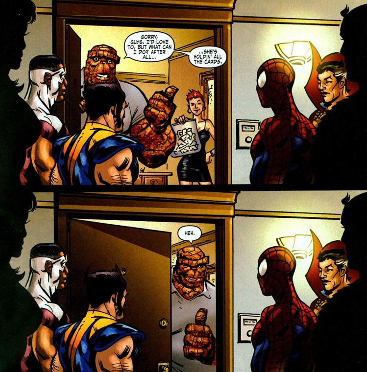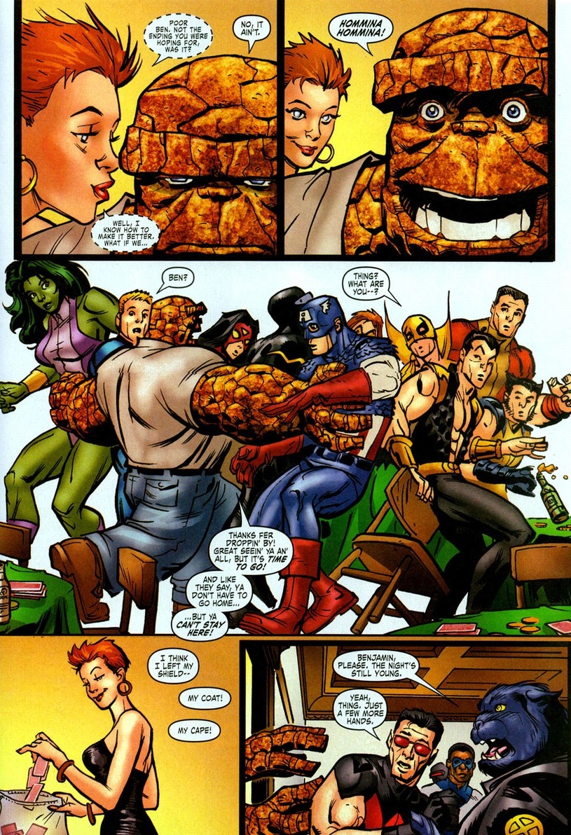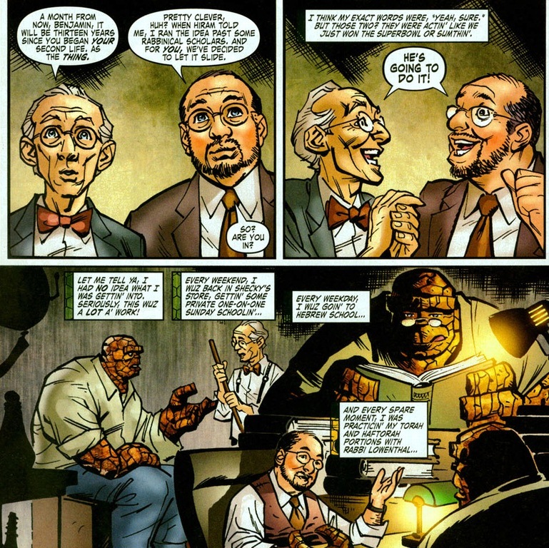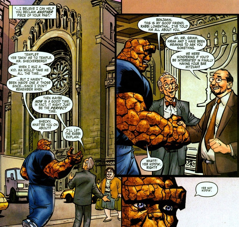 Do superheroes have formal costumes? I’m glad Wolverine showed up for the Thing’s ceremony, nevertheless, I don’t think bare arms are appropriate for synagogue.