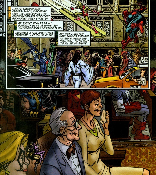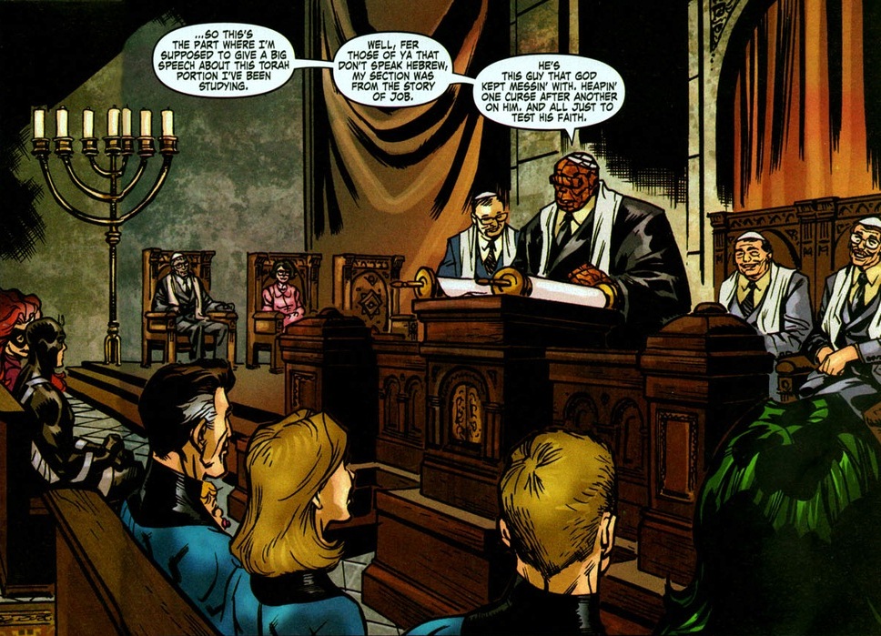 Jewish superheroes certainly exist, but you don’t see a lot of faith in the comic world. The X-Man Kitty Pryde has worn a Star of David around her neck on several occasions. Magneto may not be religious, but his Judaism got him sent to a concentration camp during World War II. The X-Man Iceman is half Jewish, and no, I’m not sure which parent. But to see half an issue devoted to a religious ceremony that doesn’t end with ninjas jumping through the roof or a crazy guy in robes performing a Satanic blood ritual, that’s almost unheard of.