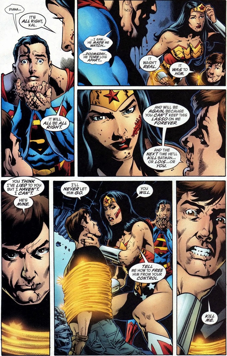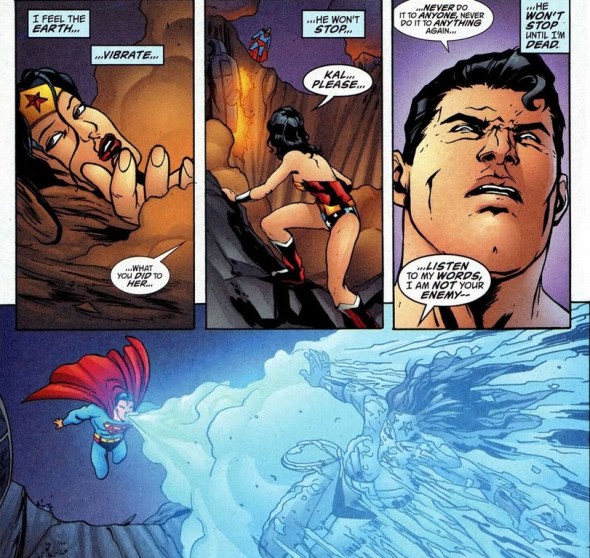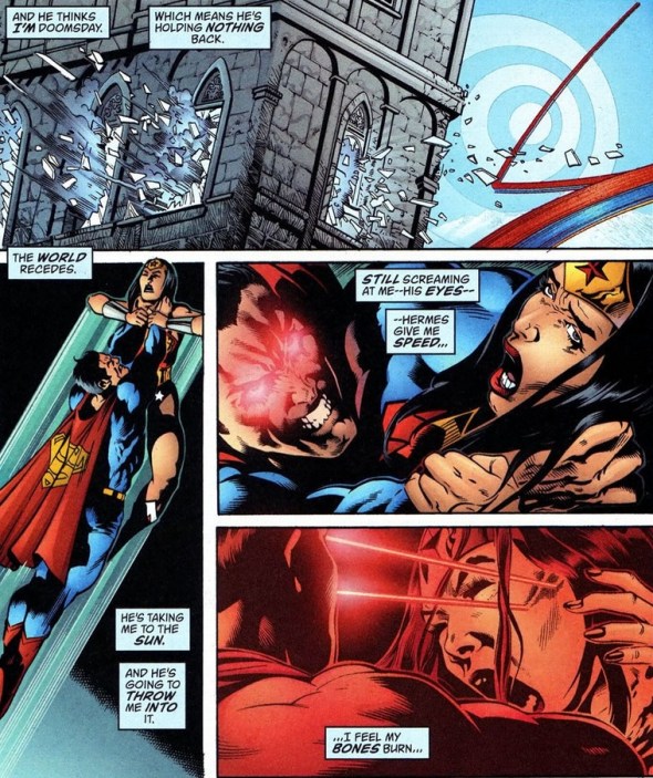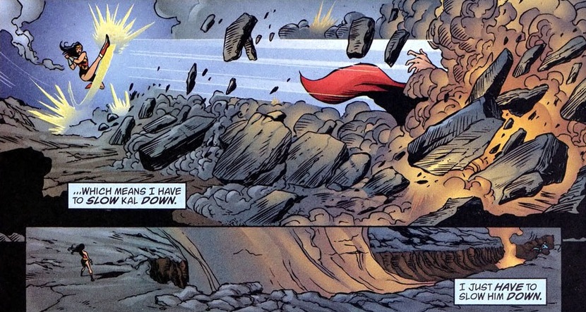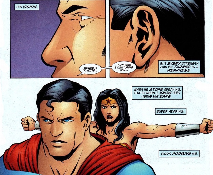Well, eventually.  Diana has spent most of her life training and sparring with her fellow Amazons. She’s a shrewd fighter with a keen eye for combat weaknesses.  So how does she take down an enemy that can’t be beaten by simply brawling?  Well, let’s remember that Superman has a bunch of cool powers that Wonder Woman doesn’t.  You know, to exploit.