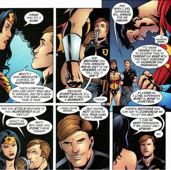 Meet supervillain Maxwell Lord.  His superpowers include influencing minds, as you’ve seen above. Also, he’s a huge perverted jerk.  But to say Wonder Woman outclasses him in sheer strength and fighting ability would be like saying Batman isn’t fond of crime.  In a fistfight, Lord doesn’t stand a chance.  So he does what most telepaths would do: have Superman kick her butt instead.