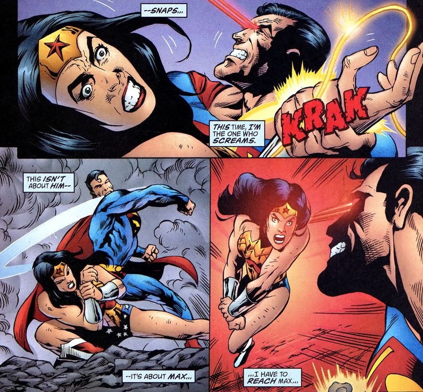 Unfortunately, for all the power that she possesses, poor Diana doesn’t have the durability of the Man of Steel.  And that means Superman can cause harm to her in ways that she can’t do to him.  Like, I dunno, this:
