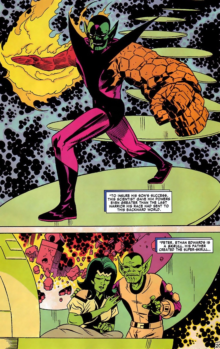 Surprise! Ethan Edwards is a Skrull! Not only that, the brother of the original Super-Skrull. Why are the Fantastic Four nervous about this revelation? Well, supervillain Super-Skrull, because of his bioengineering, has the powers of the entire foursome. Also, he wants to conquer the world for his fellow Skrull people.
