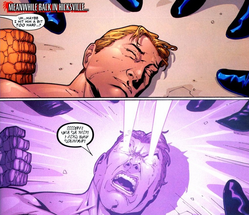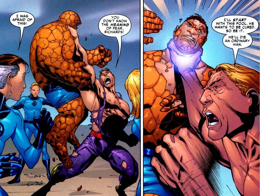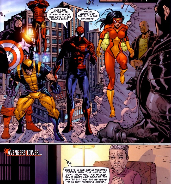 In his anger and frustration, he serves up some beatdown to the Baxter Building where the Fantastic Four live. They’re still in Iowa or something. Oh, and Spider-Man’s buddies arrive.