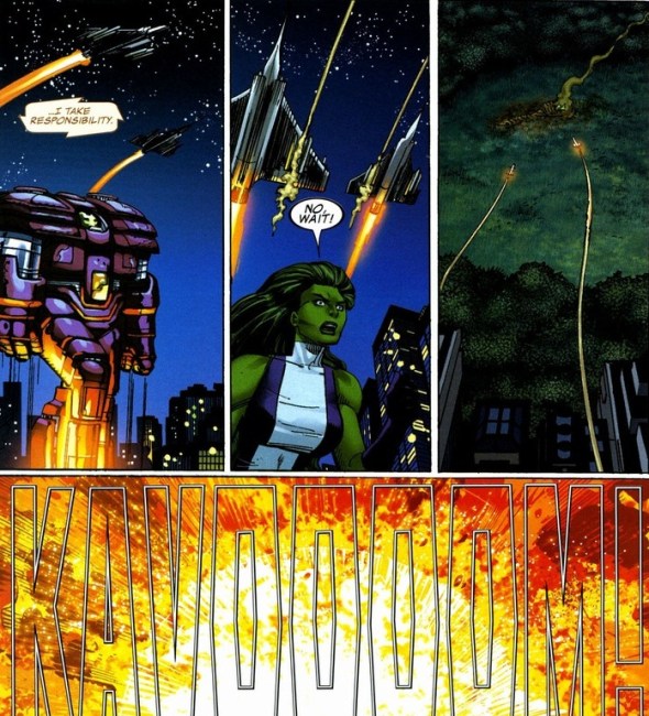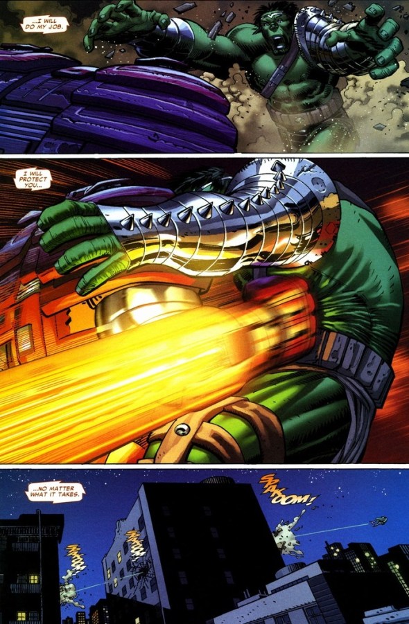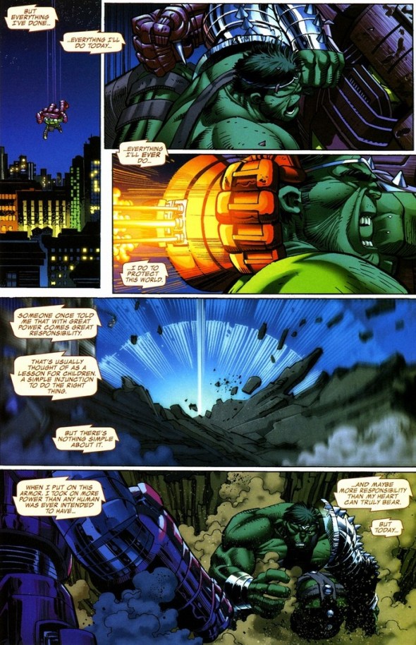 I’ve covered World War Hulk in a previous post. After Hulk’s army takes out Black Bolt and the moon, he makes a space proclamation: evacuate New York City and hand over the rest of the Illuminati (which includes Iron Man). Big surprise, the government doesn’t listen. Especially Stark, who’s the current Director of SHIELD (aka Nick Fury). Luckily, Iron Man has a bijillion dollars, and he puts together the toughest, strongest, meanest armor he has ever made. The Hulkbuster. But not while explaining what’s going on the American people. And it’s beautiful.