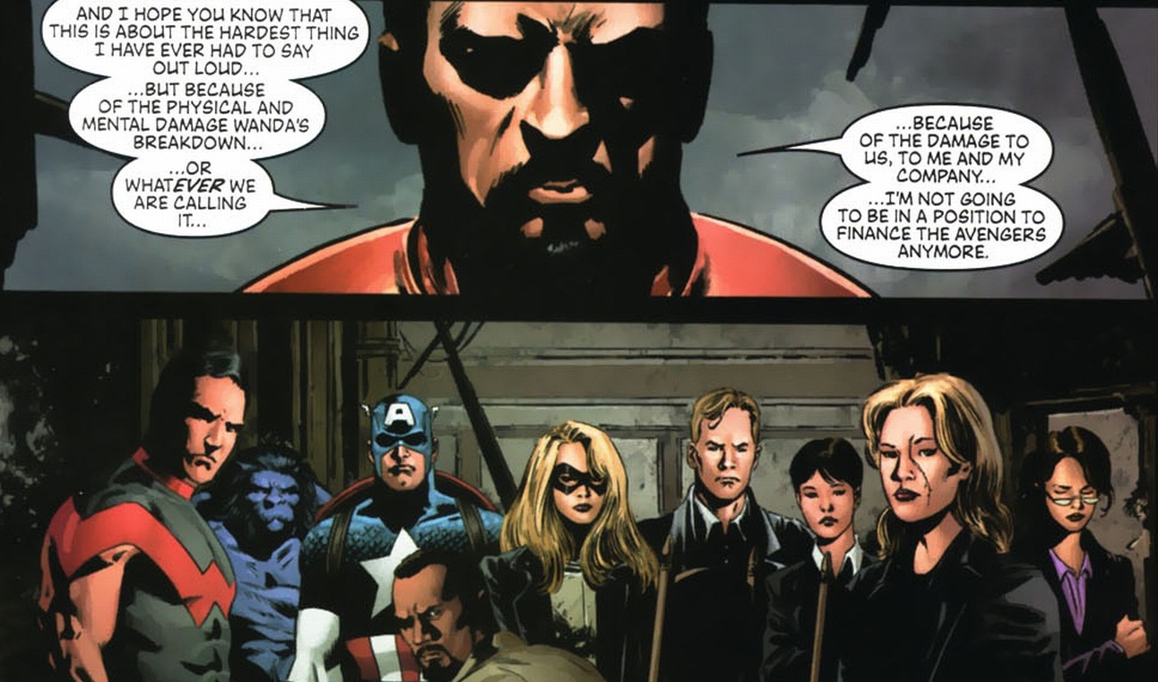 So after a whole bunch of awful stuff happening within the span of a few issues (Avengers dying, mansions blowing up, jets crashing, etc.), the Avengers decide to disband. I’m sad also.