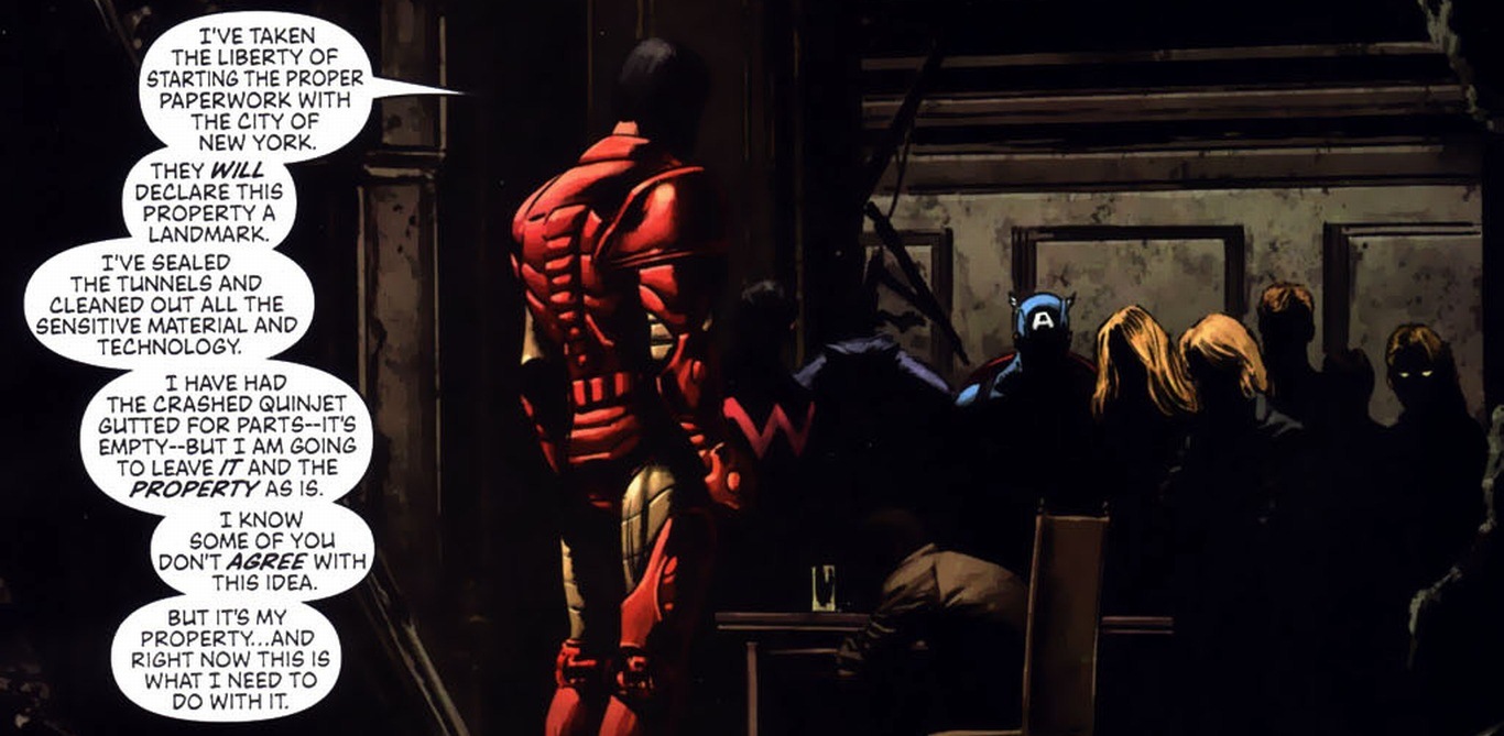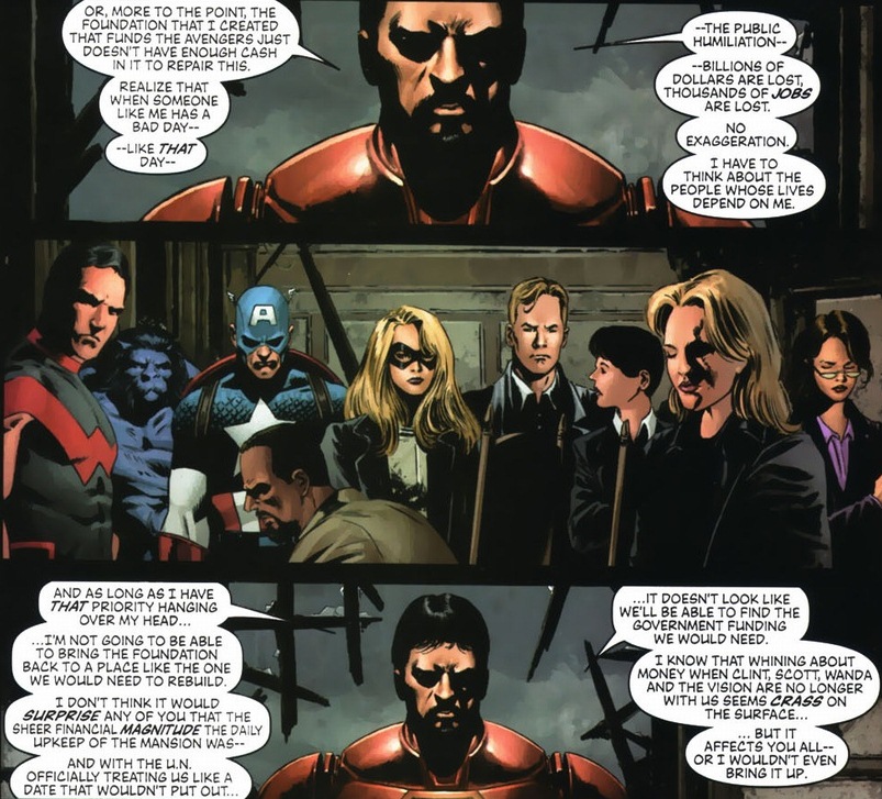 I already told you this is the speech that Iron Man dissolves the Avengers, but this is the first time these characters have heard about this. And not happy either. You know, the whole continue despite setbacks thing they seem to be fond of.
