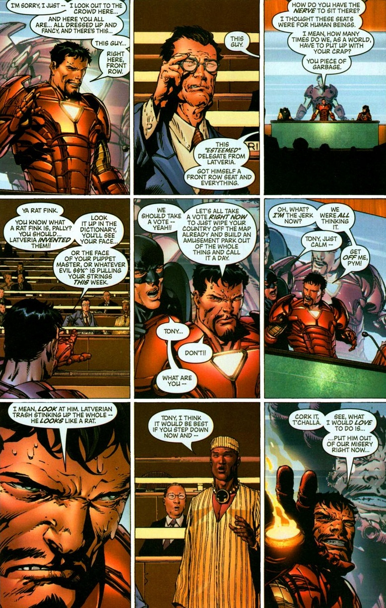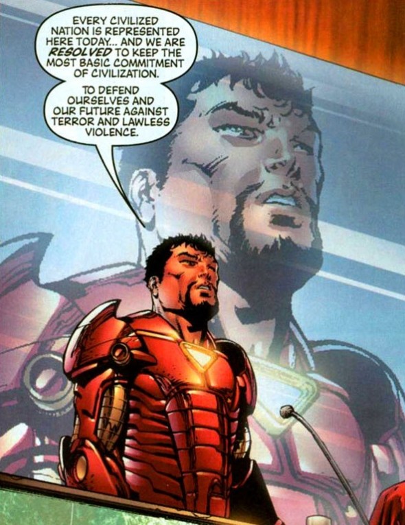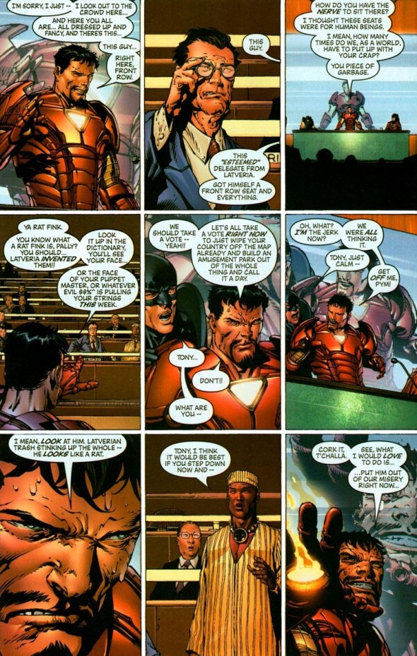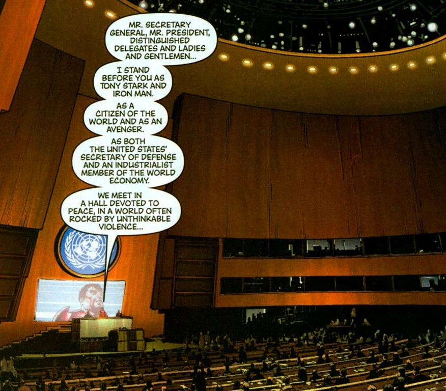 Did you know Iron Man used to be Secretary of Defense? Of the United States? Took a combination of repulsor rays and political savvy to secure that position. That means he gets to make a big fancy speech in front of the United Nations. Unfortunately, this is during the Avengers Disassembled arc, so it doesn’t go well.