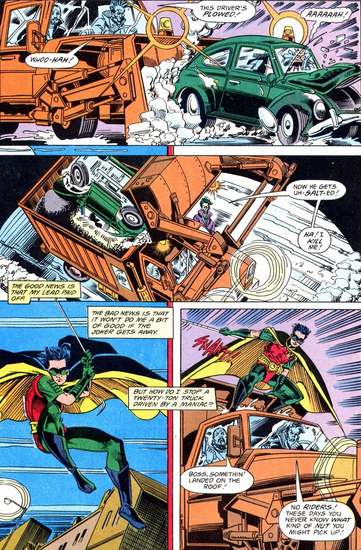 While I like to stick to comics from the past decade or so, we’re going back to 1991. Batman’s out of town foiling some international drug ring or magician riot or whatever. Robin has to patrol the city by himself for the first time. Unfortunately, Joker escaped Arkham and Drake needs to stop Batman’s most dangerous enemy without any backup or help. Will his training and skills be enough? It’s a cool premise for a story. In Robin II: The Joker’s Wild! miniseries, written by Chuck Dixon, we get to see Drake really come into his own as a detective. But we’re going to concentrate on the fistfights.