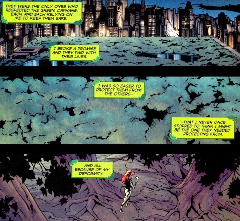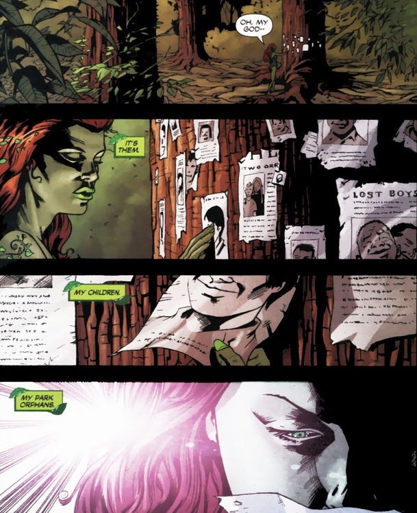 I mentioned that back during No Man’s Land, the supervillains each took portions of the city to claim as their own territory during this literal anarchy. Not surprisingly, Poison Ivy grabbest the city’s largest park. A group orphans, their parents killed during the earthquake, sought shelter and safety inside Robinson Park, not knowing Poison Ivy had taken up residence. Instead of wiping the floor with these kids, she became a sort of replacement mother and protector. Unfortunately, she’s also a lunatic supervillain, so it was only a matter of time before the inevitable happened: