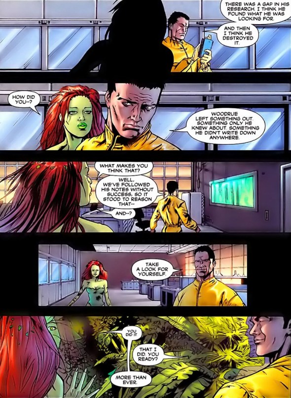 You know what comic books are naturally really good at? Montages. The panel format works perfectly. And while I’ve been skipping large portions of the story, like her confrontation with Batman, Ivy’s meetings with the supervillain Hush, her battle against one of the orphans, and secret lab experiments from some unnamed bad dudes, I wouldn’t dream of letting you miss this: Poison Ivy doing science.
