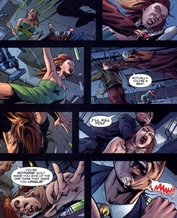 You see those eyes in that last panel? No matter what color her skin, no matter what powers she possesses, she’s always going to be a supervillain. Ain’t no rehabilitation for this woman. That fact alone makes this story terribly tragic, as she’s permanently tied to her destiny as a criminal and terrorist. And while she didn’t chose this path originally, society and jerk professors forced her down the only path she’ll ever be able to walk. Oh, and it gets sadder.