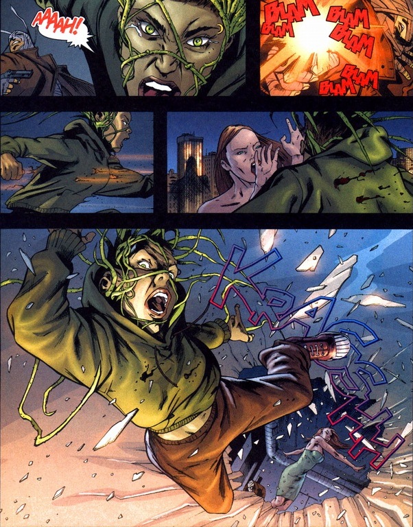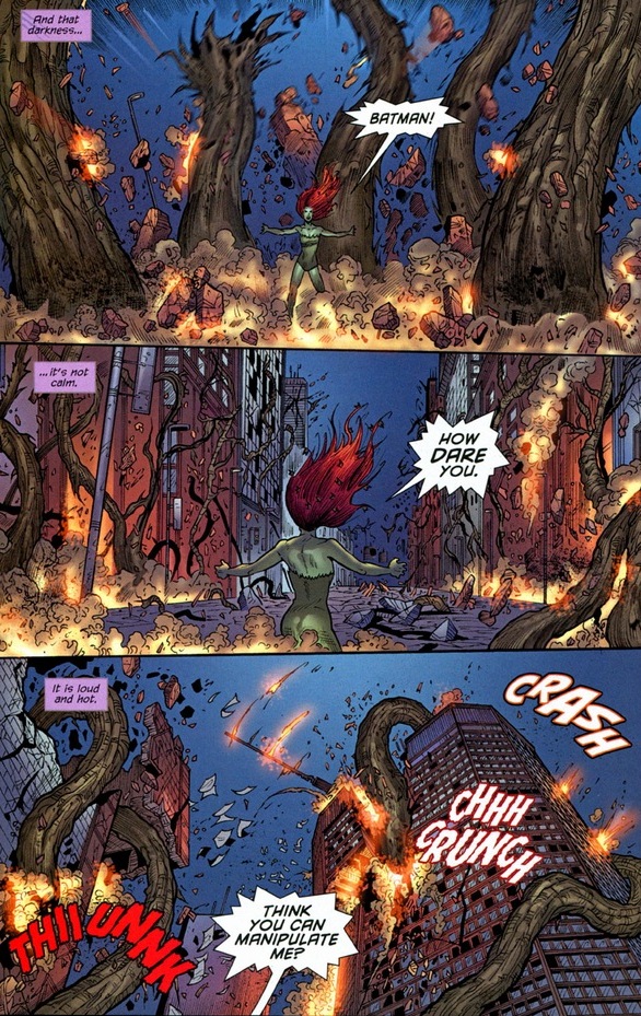 Dr. Pamela Isley began a promising career as a botanist until her crazy professor Dr. Jason Woodrue injected her with experimental plant toxins that made her poisonous to the touch and allowed her to control greenery. Thus began her criminal career as an eco-terrorist. And not the sort of terrorist with beards and rocket launchers. Here’s a quick scene from Gotham City Sirens #26: