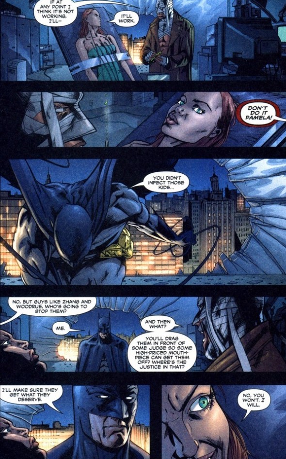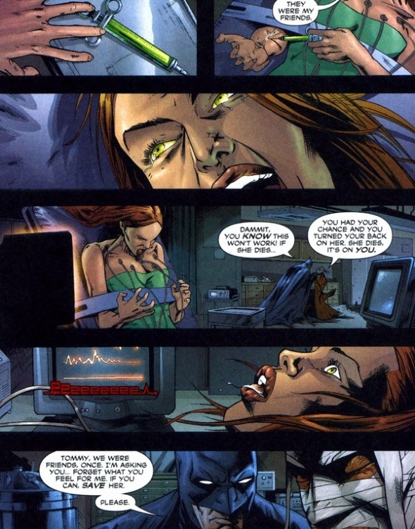 With Batman’s feelings effectively hurt, she can attempt to reverse the process. Except for one tiny problem. Turns out, Bruce Wayne won’t do it, and she has to go the back alley scientists. In this case, Hush. And besides his hokey medicine, she still has to deal with the evil organization that turned the kids into biological weapons. A few pages of struggles: