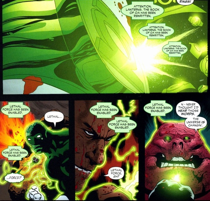 Not just because I think it’s funny, but we should talk about the idea of “willpower” as a weapon. The best I can describe the strength of the rings is this: the less fear you have and the stronger your convictions, the more powerful the ring becomes. Like the ugliest group of the most elite soldiers in the galaxy. Unfortunately, you see that squirrel shoot a green acorn in the above panel? Y’see, Green Lanterns’ primary objective is to keep the peace, which means the ring won’t let them use deadly force. The Sinestro Corps are allowed far more freedom.