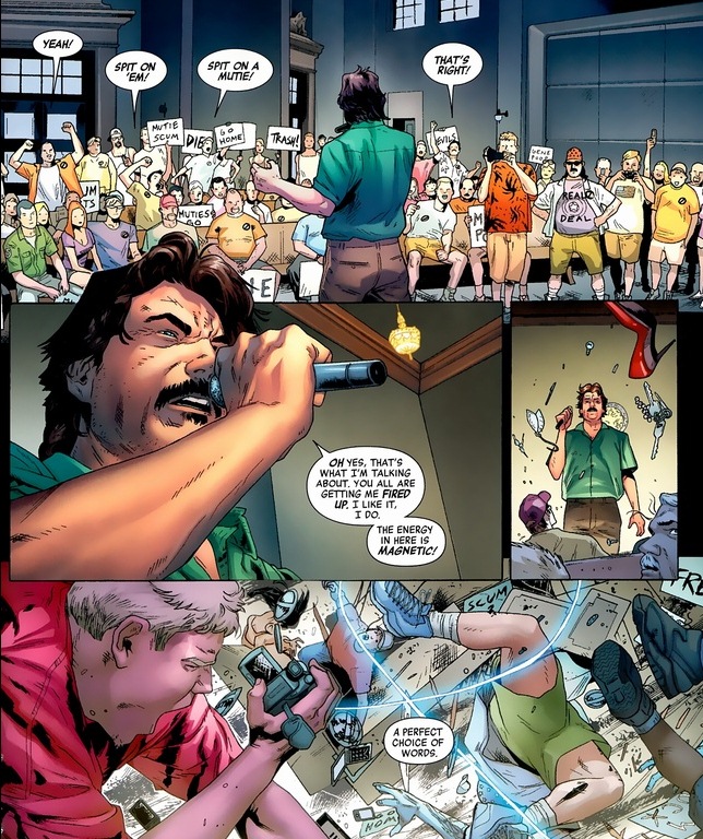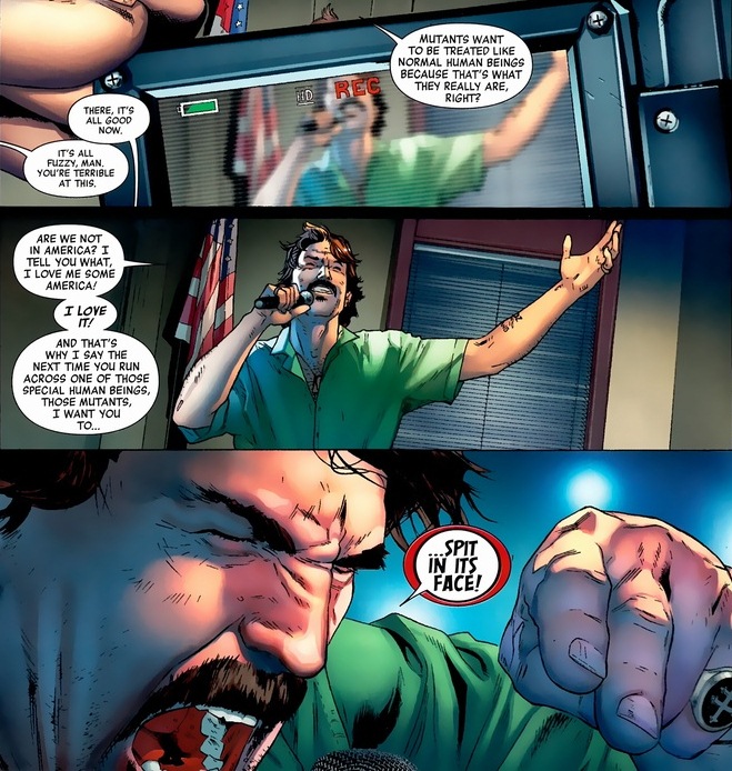 I get it. Mutants are really easy to hate. They have scary powers. Some have scales and feathers. But think about it: how many of the mutants, if they really put forth effort, can take down, say, a tank? Like half, right? If every time someone makes a mutant hate speech, there’s an actual substantial risk that a bird man can fly in and drop off an egg that shoots lasers or whatever, how often would these little get-togethers happen? And unfortunately, these bigoted jerks have to learn that lesson the hard way.