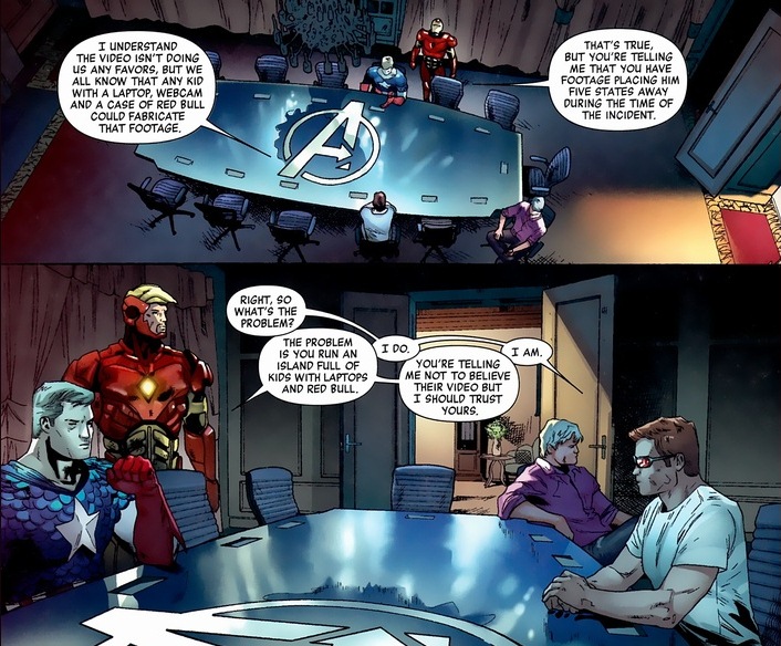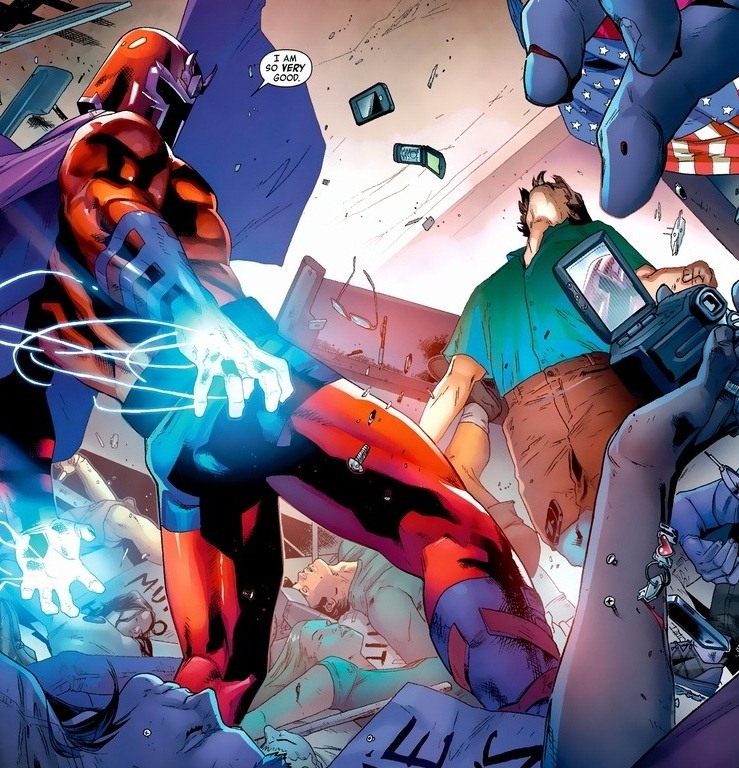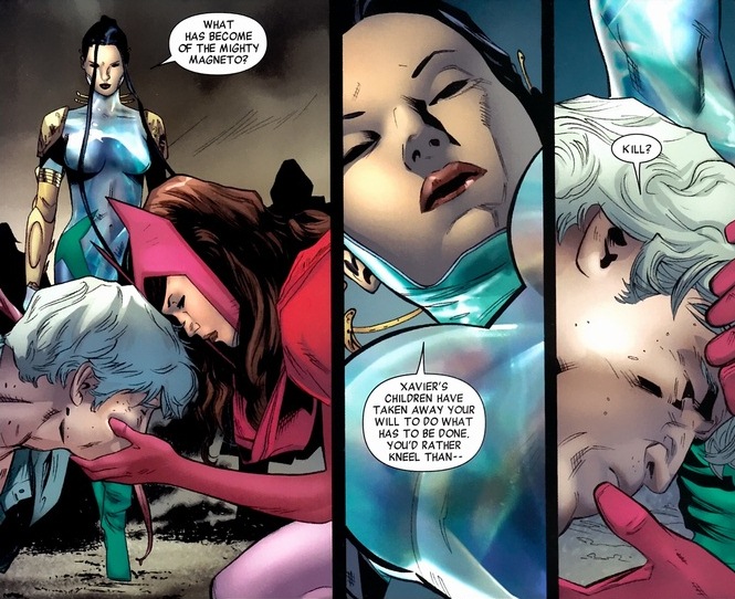 So Magneto, not quite as intimidating in a purple button-down, has to go find and deal with this impostor before the Avengers are forced to take action against the X-Men. I mean, the Avengers do take action against the X-Men, but that’s a totally different Marvel event. And that event has way less metal chucking.