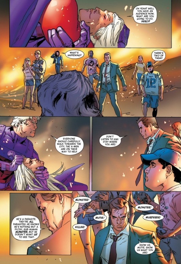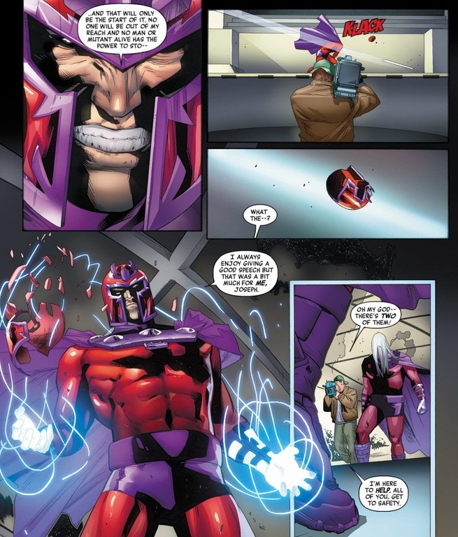 Breathe in this moment. Magneto has spent his entire adult life fighting humanity, spewing the exact hate-fueled rhetoric about humans as the man spills bile about mutants. They’re angry and aggressive, but they’re still just civilians. Professor X would turn the other cheek. Cyclops would attempt to pacify the situation. The Avengers would flee the scene. And Magneto?