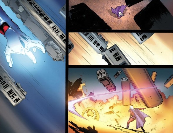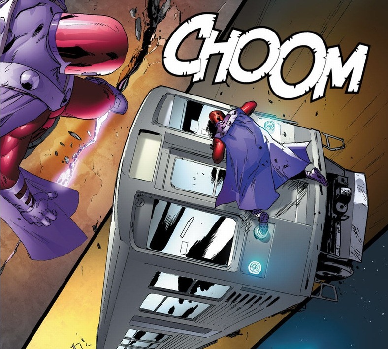 Trust me, this is the best train chucking fight you’ve ever seen. I even cut a page or two. The main difficulty in writing Magneto remains getting him into locations that happen to be Magneto-friendly. And by that I mean lots of big stuff to throw around. Oh, I guess also the politics and philosophical situations revolving around Magneto’s personal beliefs and aspirations. But mostly places to barrage dudes with transportation.