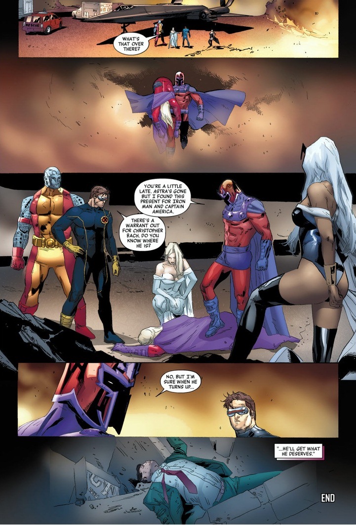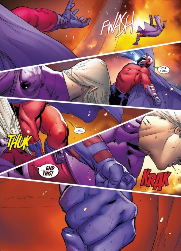Why he saves those people is up for debate. Certainly he’s at least attempting to do some good, as that’s kind of the whole point of the X-Men. And Magneto isn’t about to let innocent civilians perish in this grudge match. Maybe. I don’t know, but he does end this fight with a single blow. As the master of magnetism should.