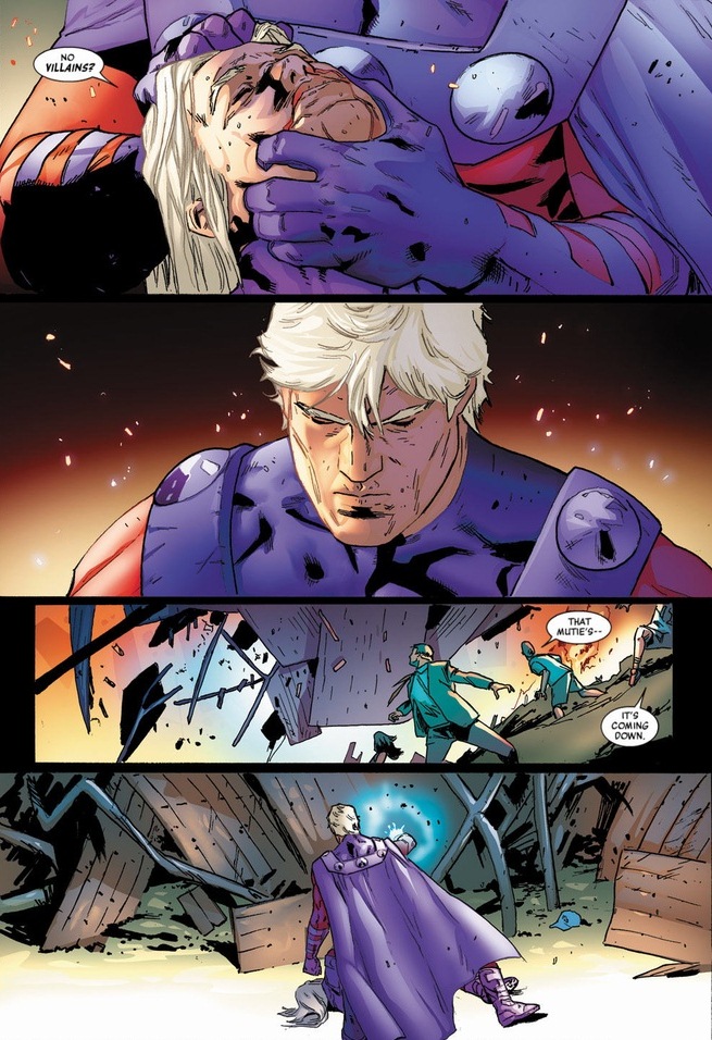 He slaughters them. After all, that’s how Magneto’s dealt with humans for over a half century and old habits die hard. Emphasis on the dying and hard. A tragic moment certainly, but he’s never truly claimed the title of superhero. The path to redemption and rehabilitation is long and arduous. And for Magneto? Baby steps: