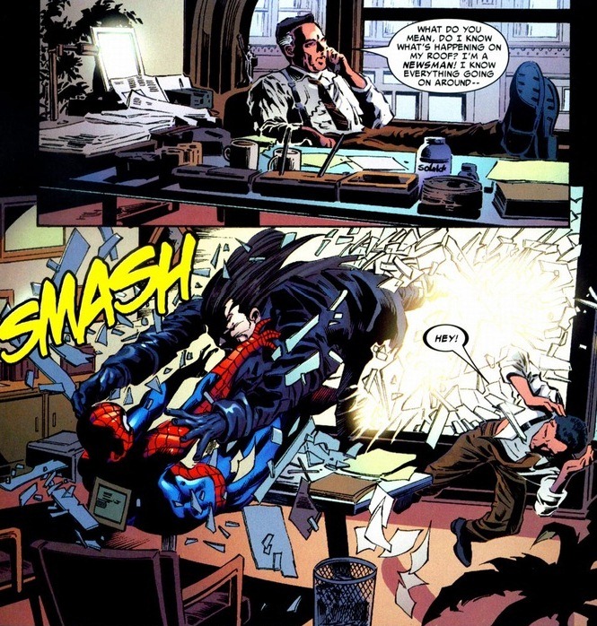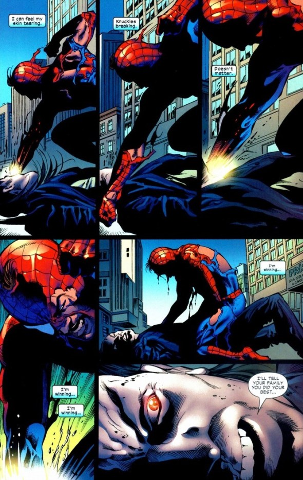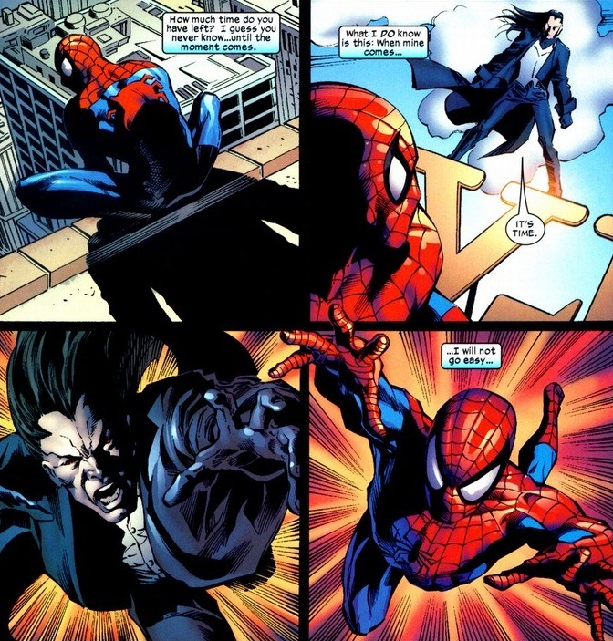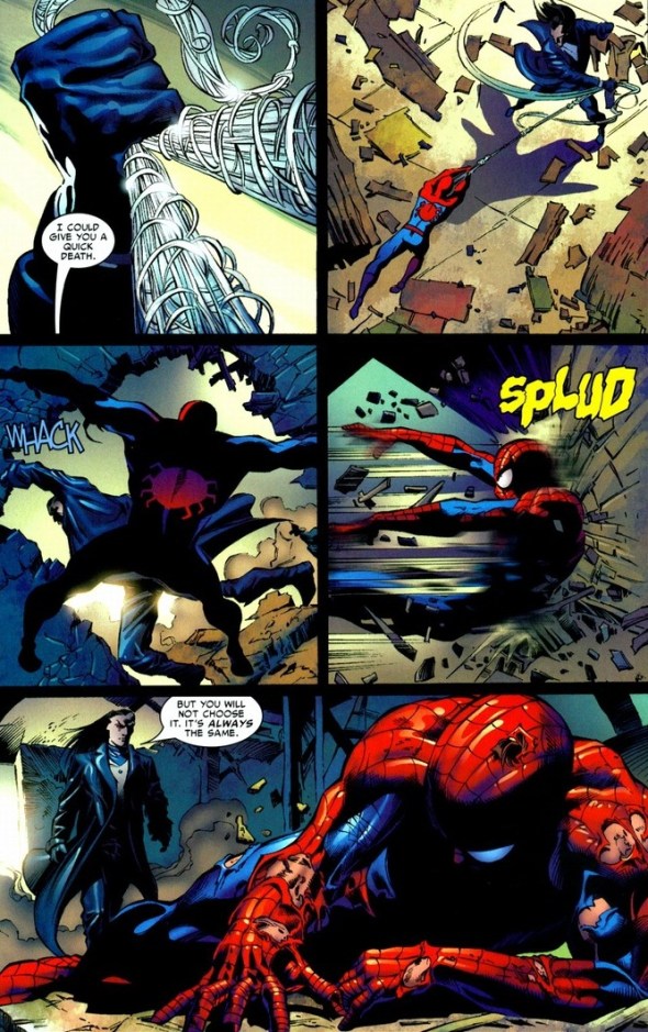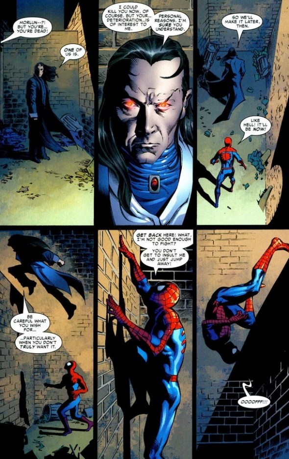 Before they brawl, Morlun shows up a few times to warn Spider-Man of what’s ahead.  Like Spider-Man’s face getting caved in.