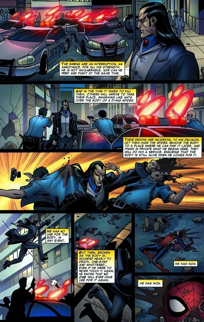 Well, at least he went out the proper superhero way instead of slowly succumbing to his mysterious illness.  Sadly for Morlun, his feasting time gets interrupting by New York’s finest.  But don’t worry, he’s a very patient man.
