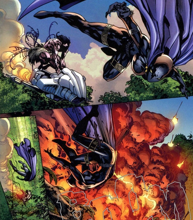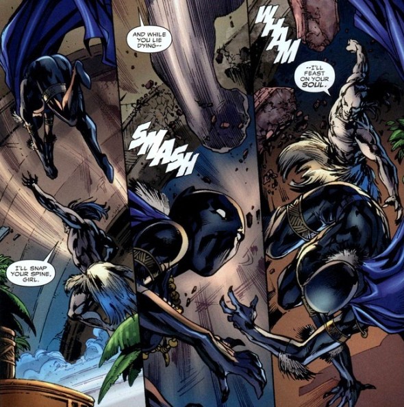 So the fight’s not going too well.  But Black Panther has a plan.  Keep in mind, she doesn’t even come close to Spider-Man’s strength, speed, and agility, and he got his butt handed to him.  If you wonder how she can take the brutal hits Morlun dishes, her costume’s made of vibranium mesh instead of Spider-Man’s costume, which is mainly the same stuff gymnasts use in their leotards.