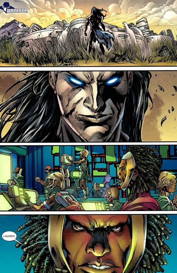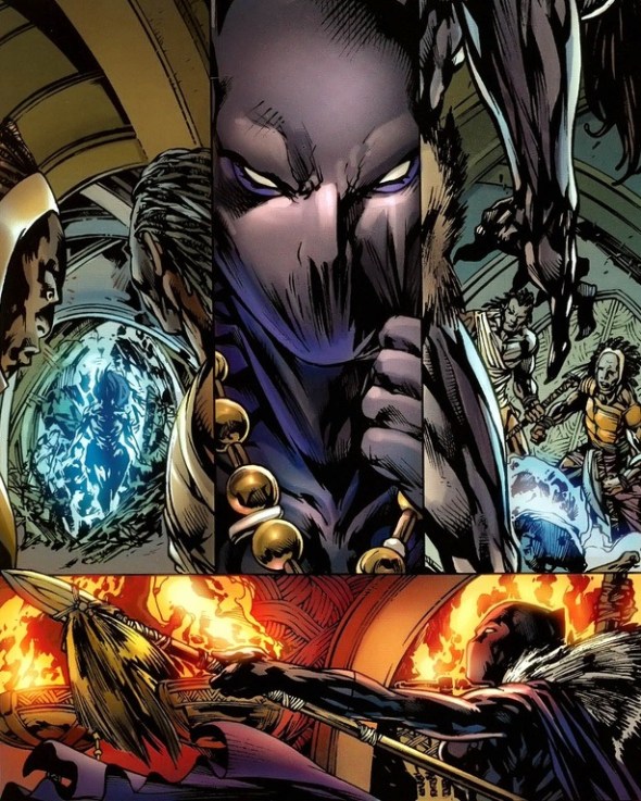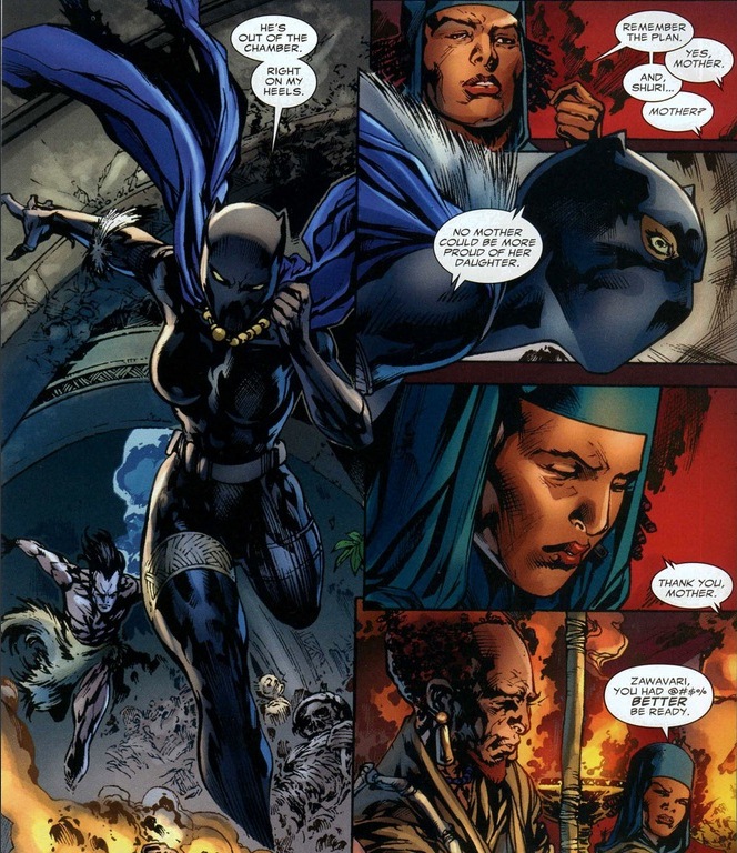 On to our story, we pick up with Black Panther #3-6, volume 5, written by Reginald Hudlin and drawn by Ken Lashley.  T’Challa got caught in an ambush and is currently in a coma fighting skeletons in some death limbo (read it yourself).  But Morlun’s on his way and it looks like the last line of defense resides in T’Challa’s sister, Shuri.  But she is the final trump card, so let’s see how the first few maneuvers go.