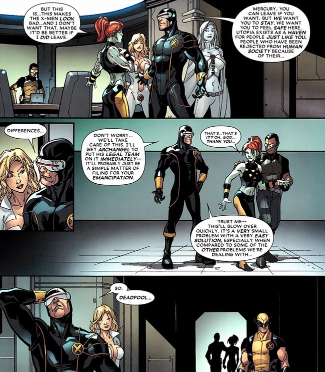 The lady with cross-boobs lady is right, and the X-Men should hang their head in shame. Luckily, before the angst and tears can be brought out, a situation develops. One that’s strangely non-violent. Probably because Deadpool’s not involved yet. If you think the X-Men are only good at shooting fireballs or blasting eye lasers, you’ve never seen their legal skills.