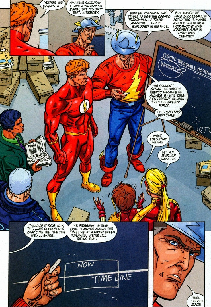 But the Zoom costume/powers? He asked his buddy Flash to use the cosmic treadmill in the Flash Museum (yeah, Wally has a good life) to go back in time and stop him from becoming handicapped. Flash refuses and Hunter tries the treadmill by himself. Of course, it explodes and thus he gains all these cool speed powers. Oh, and a seething hatred for his former friend.