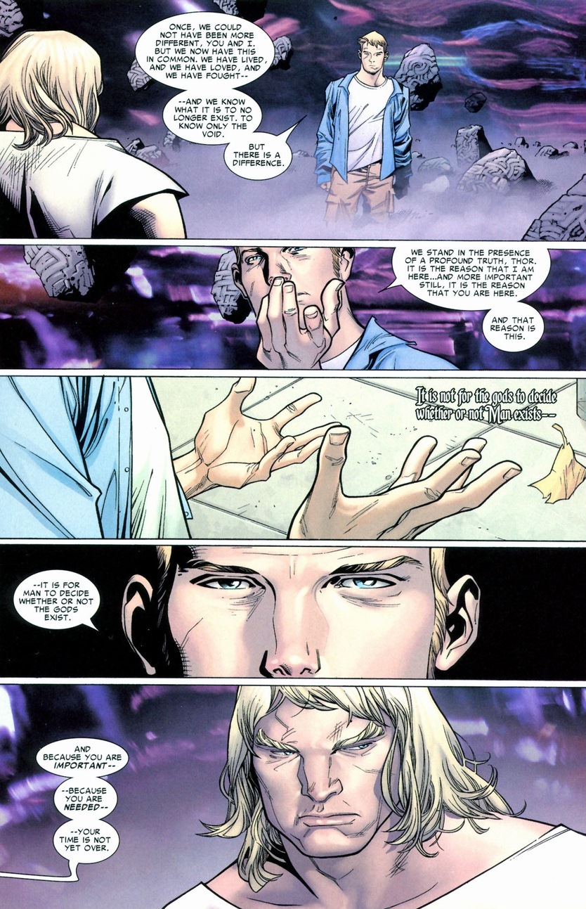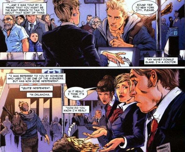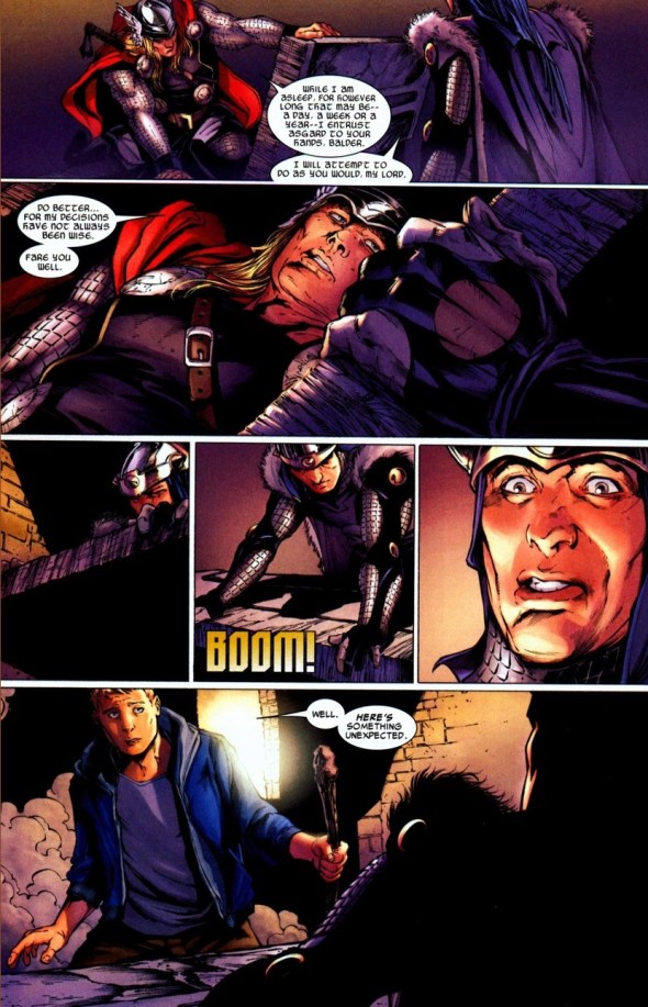 Most of you should have no idea who Don is, and that’s totally normal.  As comics have progressed and stories evolved, Don’s presence has been diminished and subsequently done away with for long periods of time.  But he can’t truly disappear, as Thor and Don share the same body.  In Thor #1-12, 601-604, volume 3, written by J. Michael Straczynski and drawn by Olivier Coipel and Marko Djurdjevic, brought back Don Blake and continued his relationship with Jane.