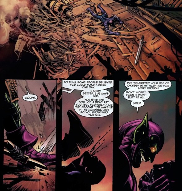 All I’m saying is Nick Fury wouldn’t crucify a teammate. Anyway, as Green Goblin continues to rampage throughout the helicarrier, Songbird has to face him alone to save everyone aboard. A super awesome fight, but you’ll have to read the book for that rumble. In summary, if you ever wonder how a mentally ill man in his mid-50s classifies as one of the top baddies in the Marvel universe, reference this arc.
