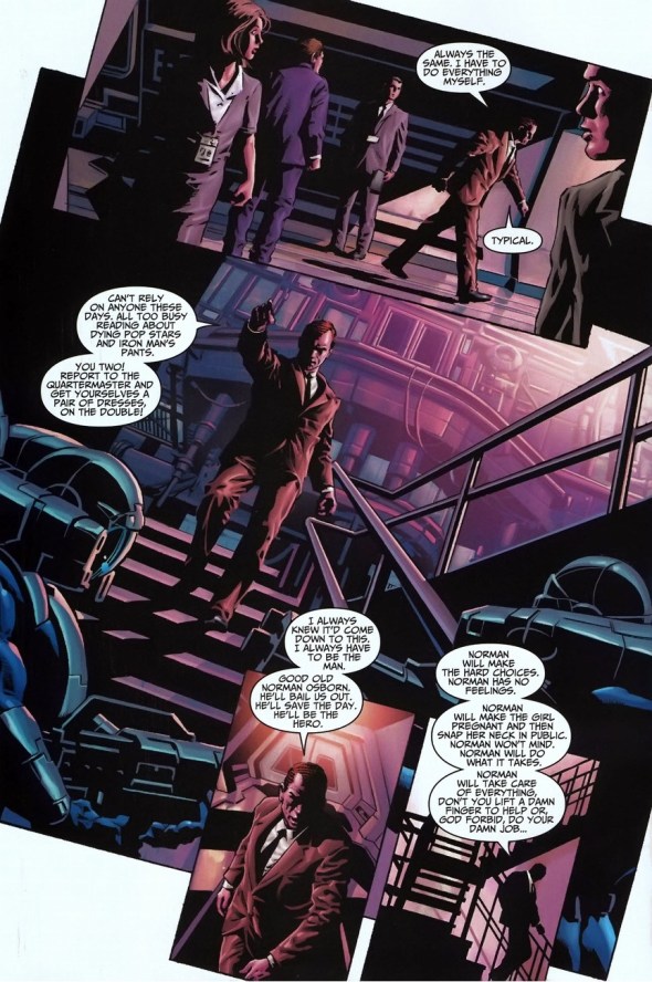 I present to you the absolute best monologue ever given by a supervillain. Ellis gives Osborn more character development in the next four pages than he’s been given in years. It’s a gorgeous, insane rant and just a perfect characterization of the craziest man in the entire good ol’ USA.