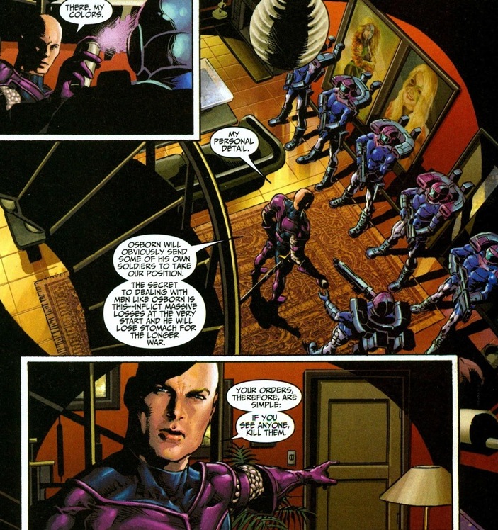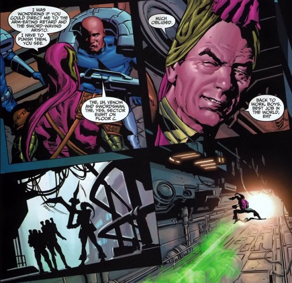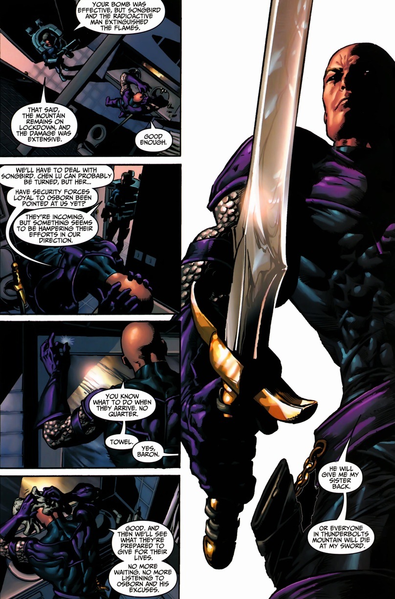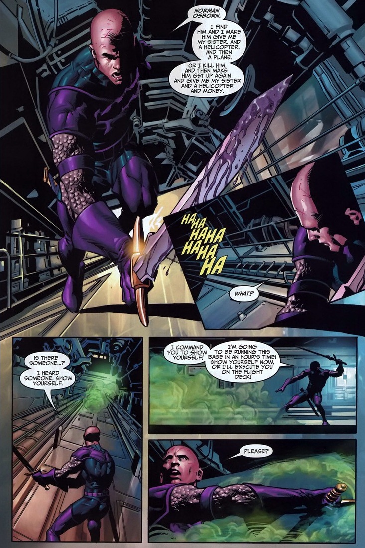 Swordsman’s the son of Baron Strucker, the World War II evil Nazi maniac that founded HYDRA, one of the two major terrorist organizations that pop up all the time in comics (the other’s AIM). Andreas’ father, being a bad guy, experimented on the womb of the mother of his twin children, giving them magic powers or something. Now Swordsman can shoot electricity out of his sword, as long as he’s touching his sister. One problem. Sister’s dead. In a super creepy move, Andreas flayed his sister’s skin and wrapped it around his sword so his special powers still activate. Gross. Anyway, by joining the Thunderbolts, Osborn promised to clone his sister and reunite the happy family. One more problem. Swordsman has waited far too long and his patience has given out. You know what that means: mutiny on the helicarrier!