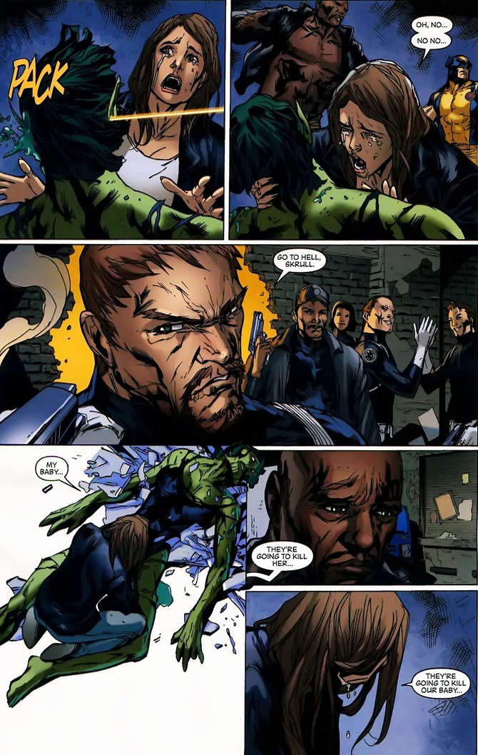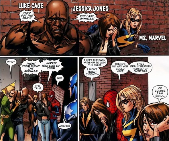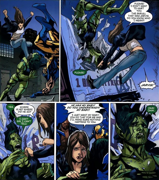 Jarvis, the butler of the Avengers and Marvel’s Alfred, happened to be a Skrull secretly portraying him. He also kidnapped the couple’s infant child. We follow along with the events of the New Avengers #48-49, written by Brian Michael Bendis and drawn by Billy Tan. After a dozen pages of calling in favors and frantic searching, Jessica Jones stumbles upon (clobbers) a lead.