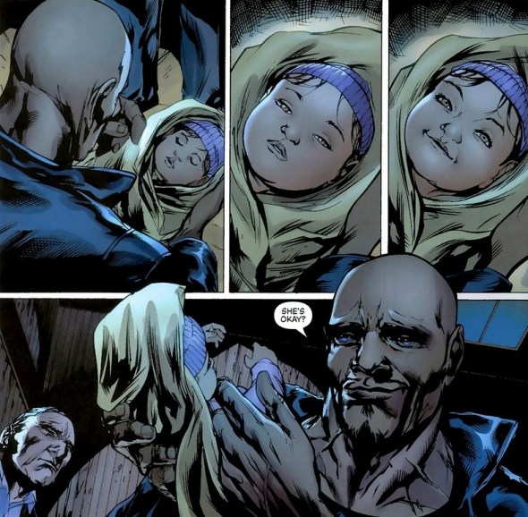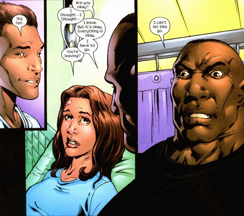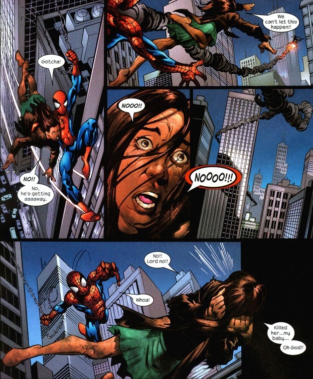 Our first one takes place in Pulse #5, written by Brian Michael Bendis and drawn by Mark Bagley and Scott Hanna. Jessica Jones finds out she’s pregnant at the end of her solo series Alias, which is sort of the prequel to Pulse. Unfortunately, being a semi-retired superhero surrounded all day by other superheroes tends not to be good for a mom-to-be. You know, when stuff like this happens: