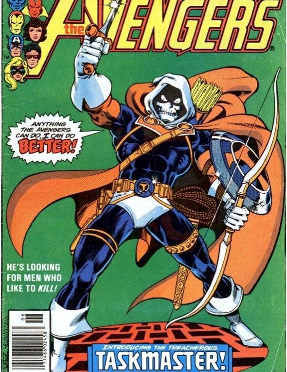 All those weapons and tools?  Tony Masters (aka Taskmaster) has the special ability of photographic reflexes.  Once he sees something done, he can imitate it perfectly.  Hence the replica of Captain America’s shield and Hawkeye’s bow and arrows.  Here he is in his first fight against the Avengers: