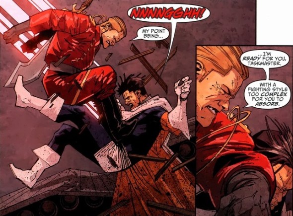 We pick up in Taskmaster #1-4, volume 2, written by Fred Van Lente and drawn by Jefté Palo.