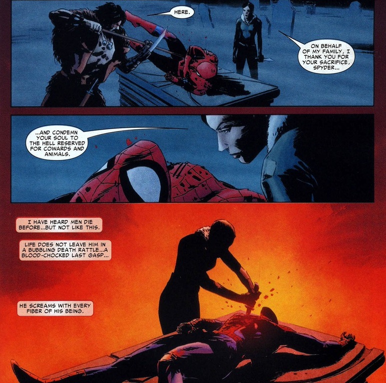 Yup, Spider-Man hangs up dead on the wall next to Kraven’s prized water buffalo and closet full of animal fur vests. I’m not messing with you, I promise. Peter Parker died on that stone tablet bringing Kraven the Hunter back to life. The end.