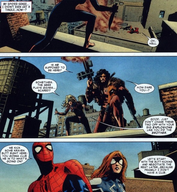 Look, from a logical standpoint, Spider-Man takes down these suckers no problem. They possess no superpowers, except maybe extra insulation from the cold in those exotic furs. But if you just look at every characters’ bench-press and 100 yard dash scores, then Batman would be a smear on the Gotham sidewalk the first month he flew around in a bat costume. Y’see, just like the Dark Knight, the Kravens have that superpower of over-preparation. You can’t beat them if they already have every counter-tactic covered.