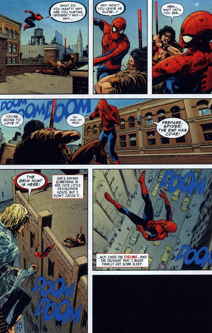 Today, we explore Amazing Spider-man #634-637, written by Joe Kelly and drawn by Michael Lark, Stefano Gaudiano, and Marco Checchetto. This arc Grim Hunt culminates as the finale to a five part series called Gauntlet where supervillain Kraven the Hunter’s family members unleashed depressing problem after depressing problem. Y’see, Spider-man’s easier to capture when he has low morale, a broken body, and swine flu. Now the Kravinoff family makes their move, striking at everyone who wears an arachnid on his or her chest.