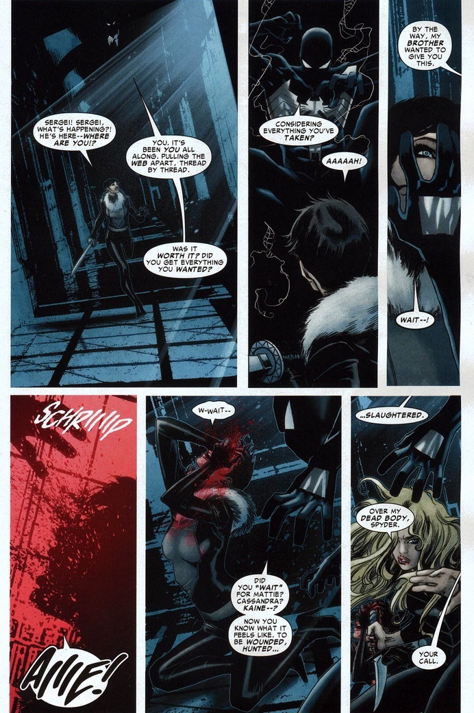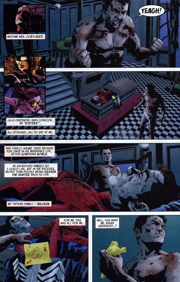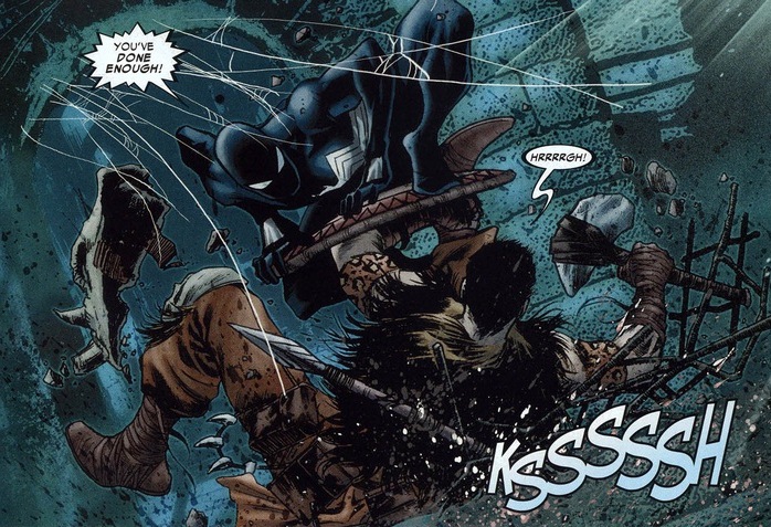 Maybe the Kravinoffs shouldn’t have given Spider-Man his black costume in the middle of night. We’ve seen Peter brawl his way to victory, like against Kingpin, but now you lucky readers get to see Spider-Man fight in a vastly different manner. A much scary manner.