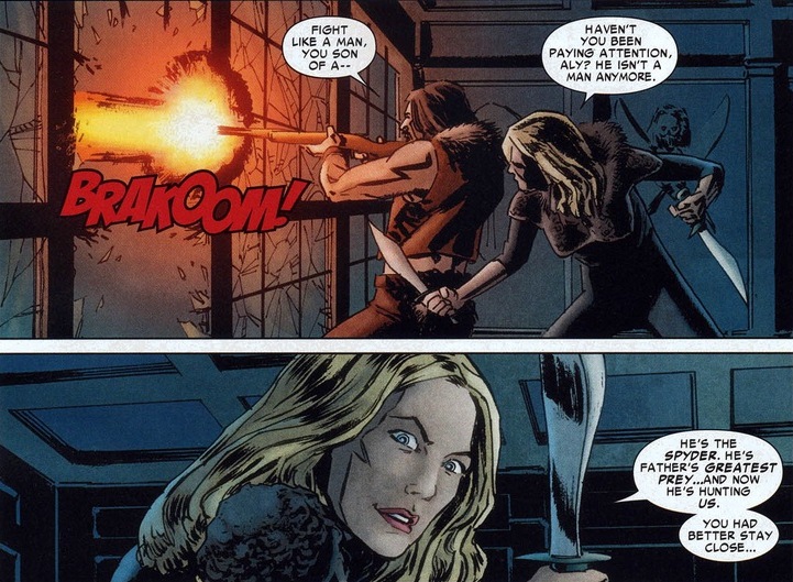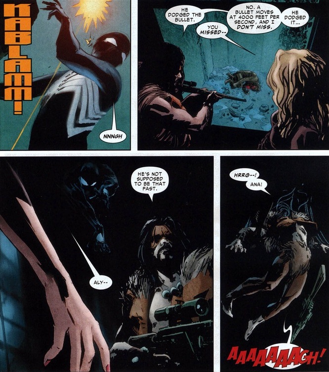 Iron Man and Hawkeye prefer prisons. But neither of those gentlemen have animalistic influences in their background. Y’know how I told you a few weeks ago that many Spider-Man comics in the early 2000s explored whether Spider-Man’s powers came from science or magic? That debate hasn’t really been answered. Back to punching.
